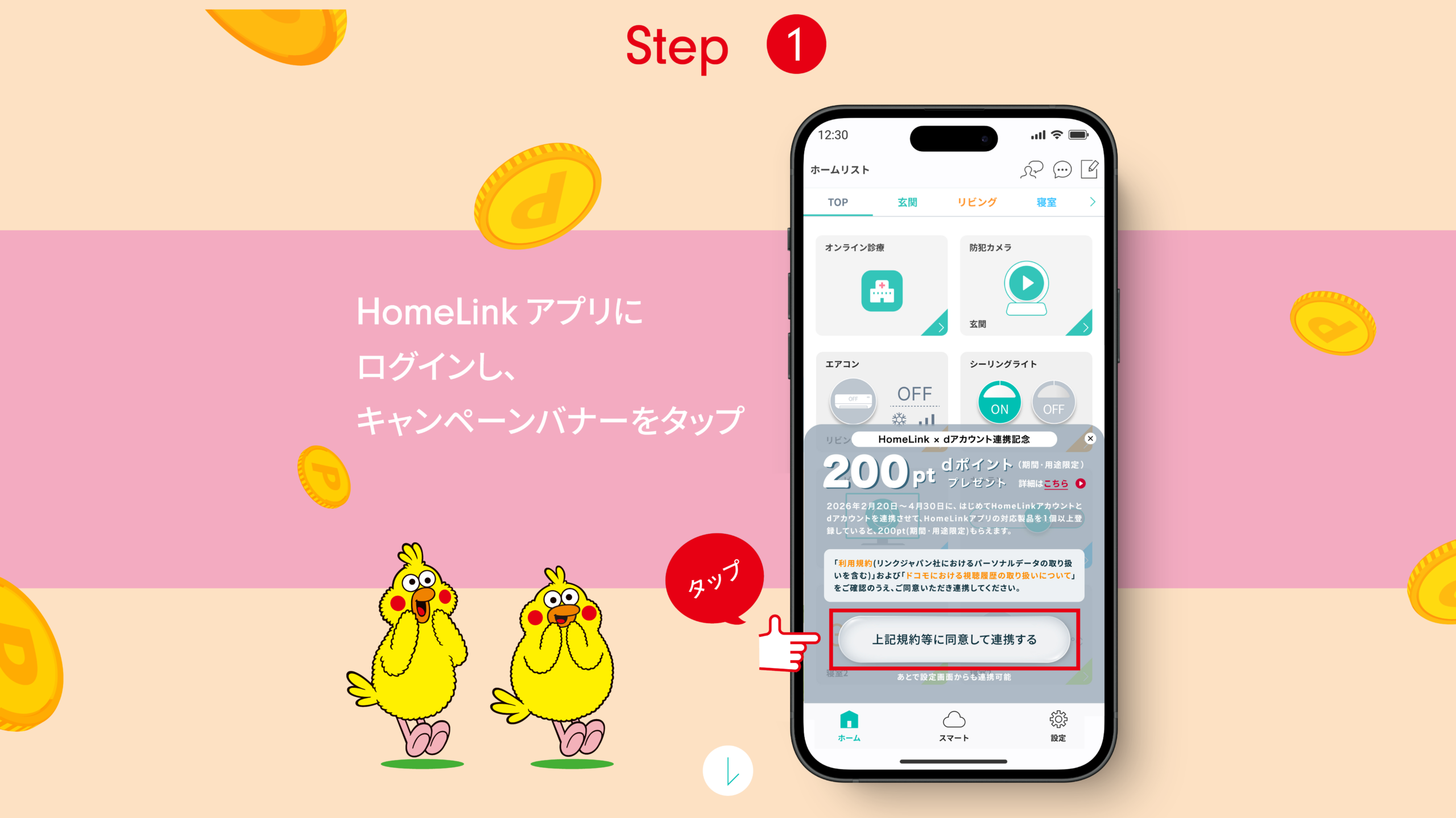 - キャンペーン期間中に初めてHomeLinkアプリ(以下「HomeLink」といいます)でHomeLinkアカウントとdアカウントの連携を行った方