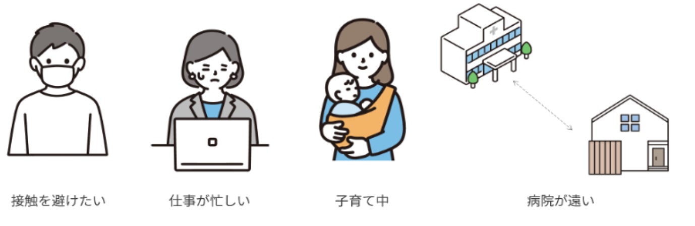 コロナ禍以降、「他の患者との接触リスクを避けたい」との思いから、医療機関の受診を控える患者が目立つようになりました。また、「日中は仕事が忙しい」「まだ子どもが小さいため目が離せない」などといった理由から、気になる症状があるのに通院を先延ばしにしている人も少なくありません。他にも「自宅から通える場所に医療機関がない」「身体的な事情で外出が困難」など、さまざまな事情で通院にハードルを感じている人もいます。