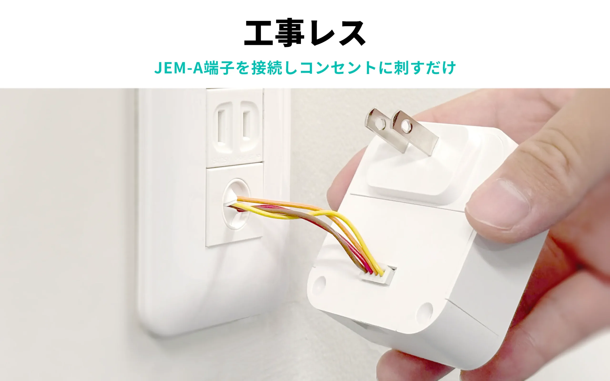 壁のコンセントに直接装着し、JEM-A通信用の4芯ケーブルを本体裏面の端子に繋ぐだけで使用準備が完了します。煩雑な電源配線がいりません。