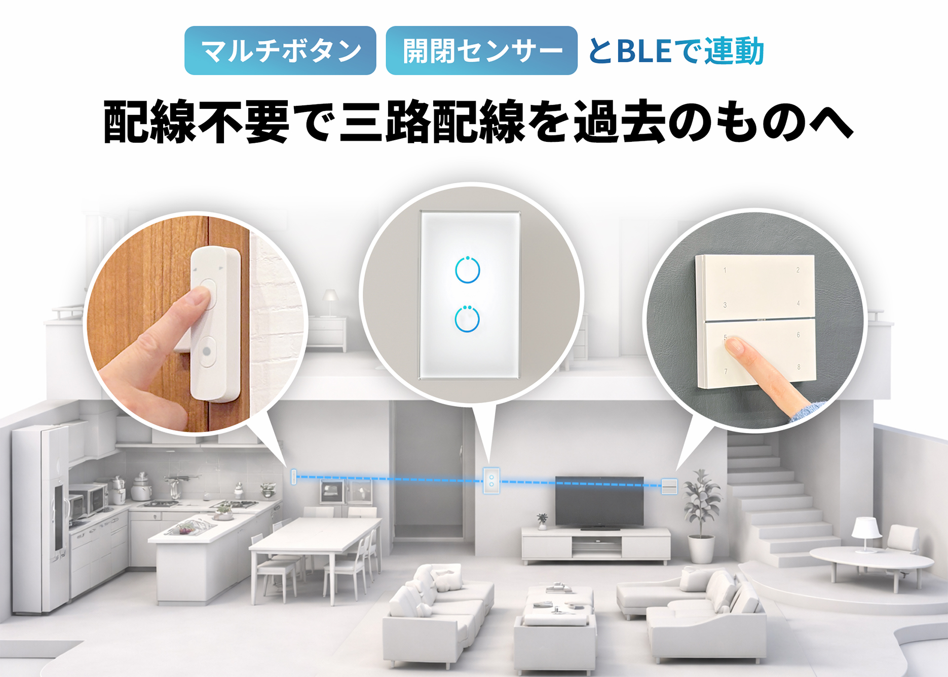 インターネットや複雑な配線を必要とせず、任意の場所にマルチボタンやボタン付き開閉センサーを設置するだけで、複数箇所から照明を操作することが可能です。