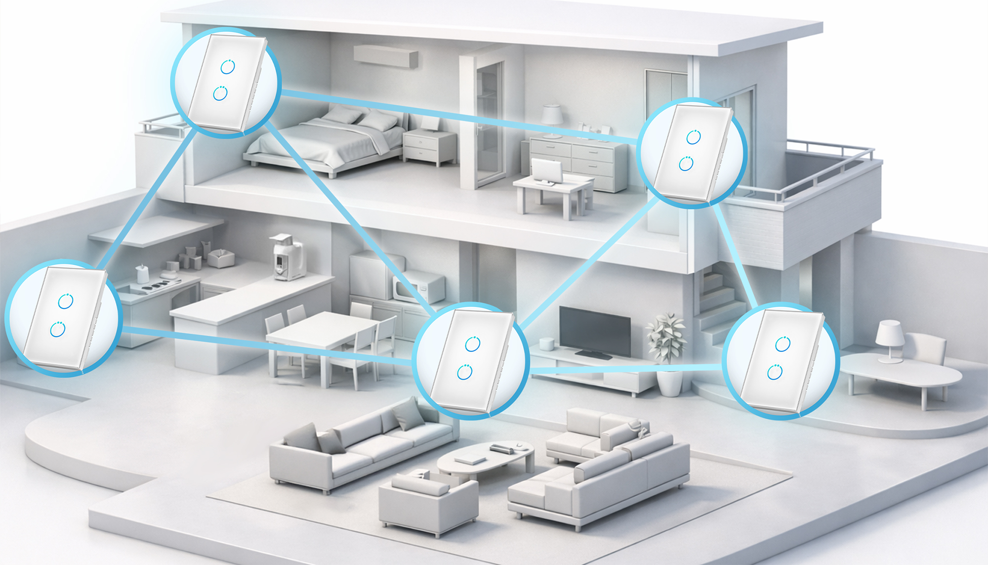 複数の照明スイッチ(BT)同士がメッシュ通信し、通信範囲をお互いにカバー(メッシュネットワーク)中継機器を追加することなく、家全体を確実にカバーします。