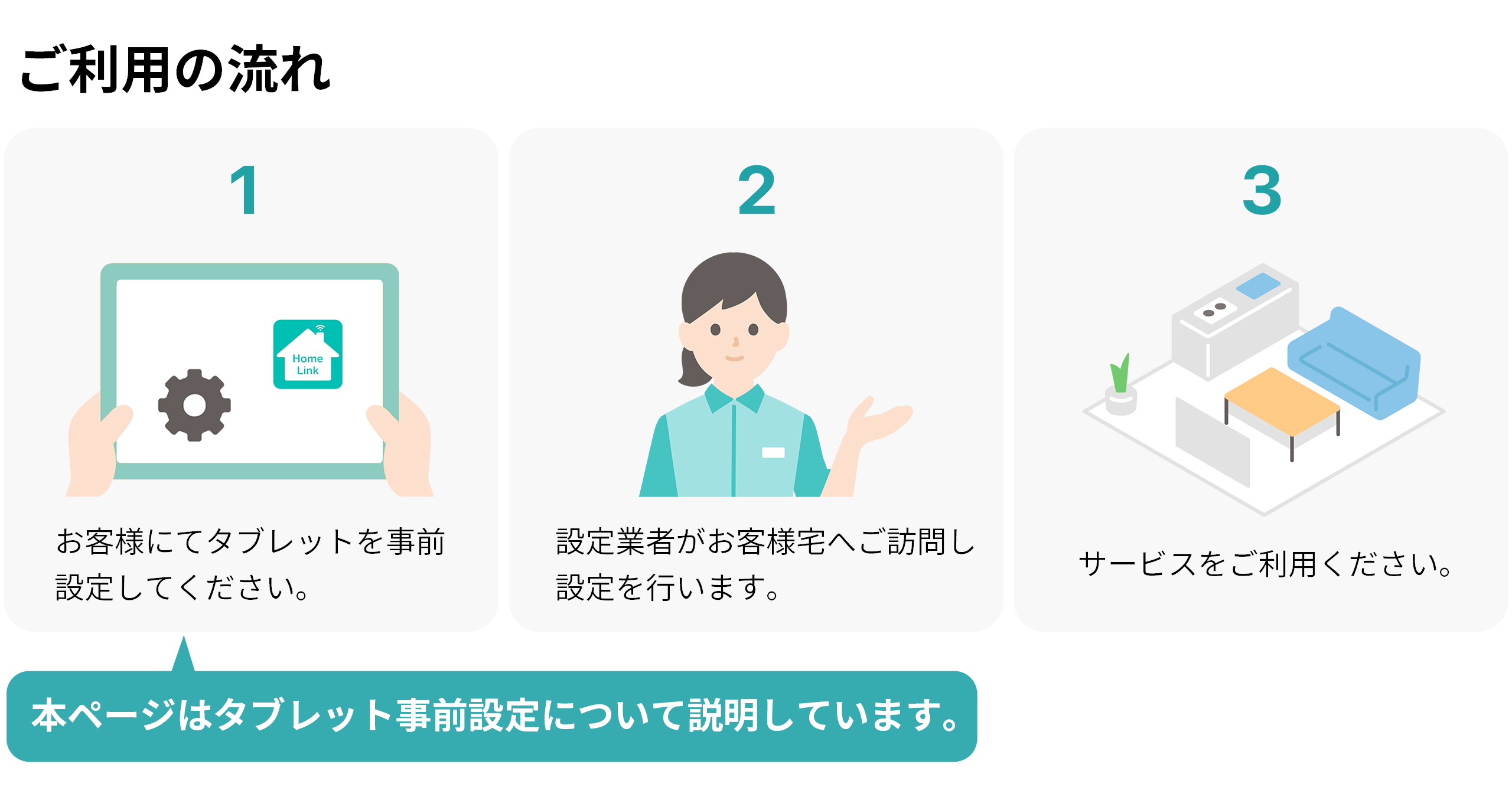 HomeX Displayに変わりタブレット端末をご使用いただく場合、提供されたタブレットの事前準備が必要となります。