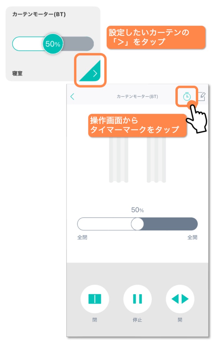 - 3. カーテンを全開の場所まで移動させ、リモコンの「開く」を2秒間押します。