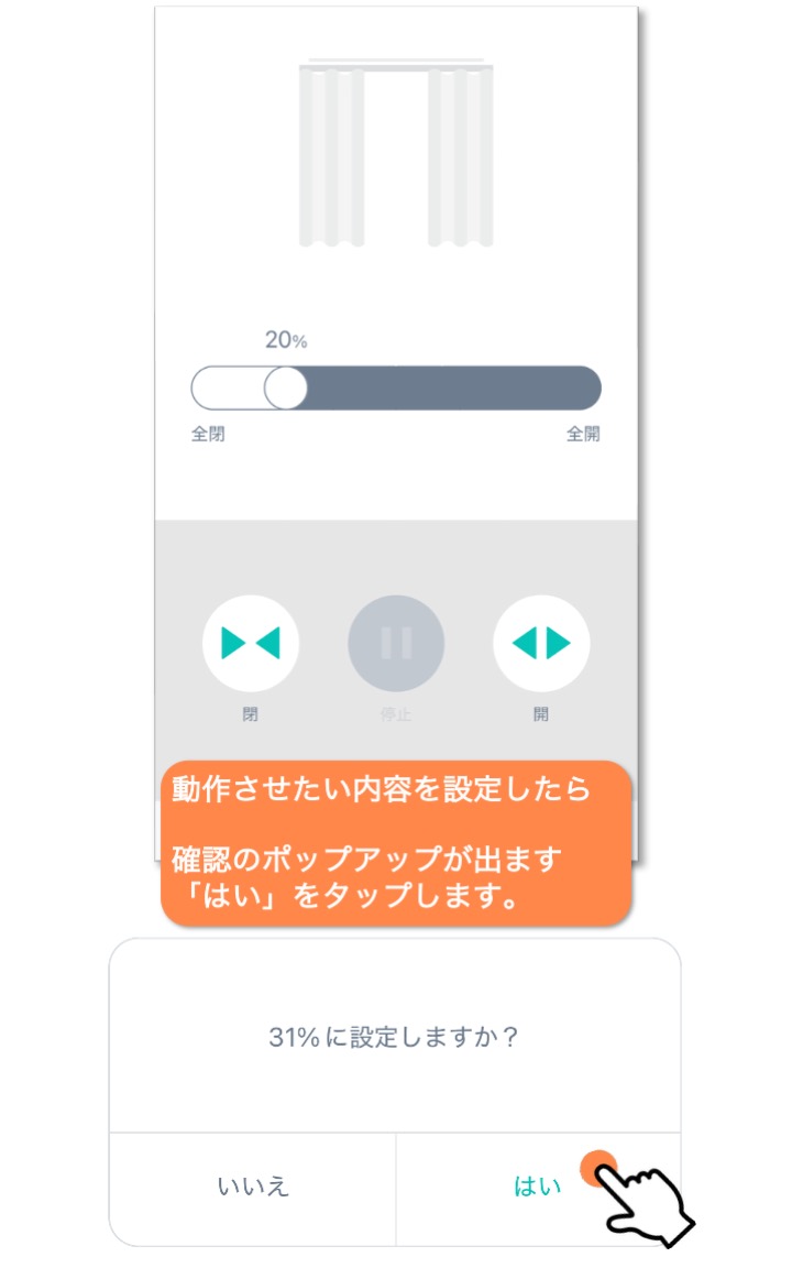 モーターがレールの全開位置と全閉位置を学習し、%単位での操作ができるようになります。