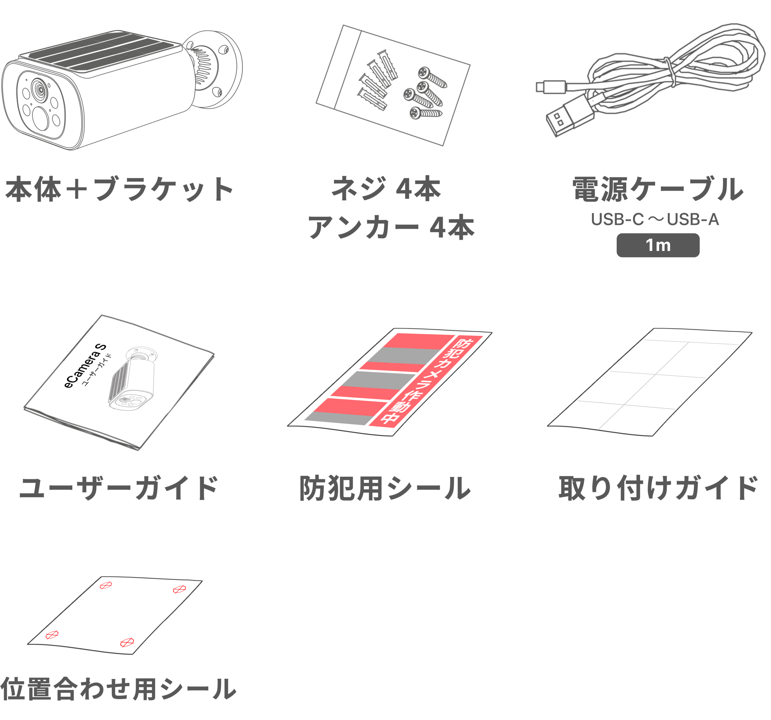 | 付属品 | 1. カメラ本体 2. ブラケット 3. ステッカー 4. USB-C to USB-A ケーブル 5. 取り付け用ビス 6. ユーザーガイド |