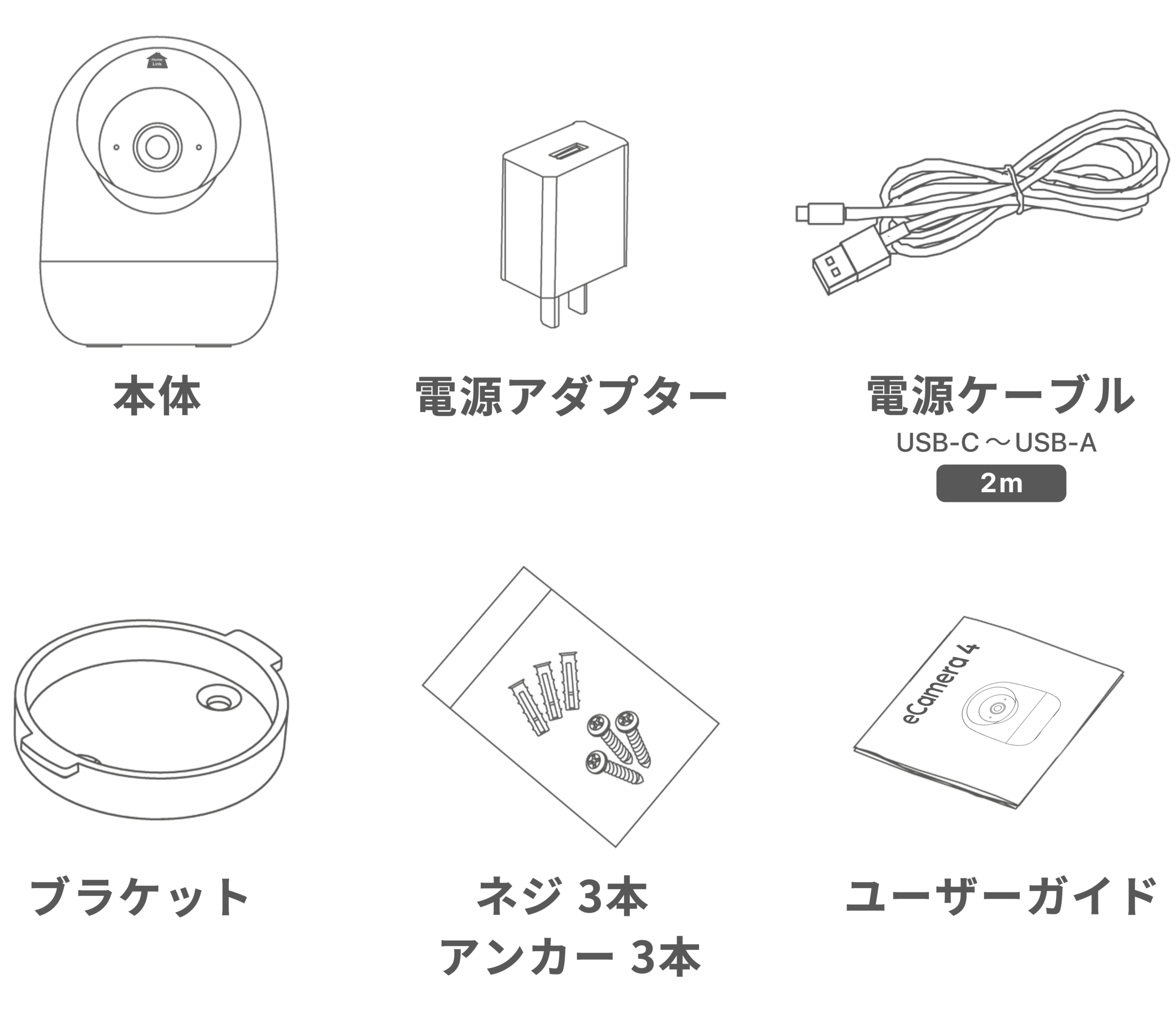 | 付属品 | 1. カメラ本体 2. ブラケット 3. 電源アダプター 4. USB-C to USB-Aケーブル 5. 取り付け用ビス 6. ユーザーガイド |
