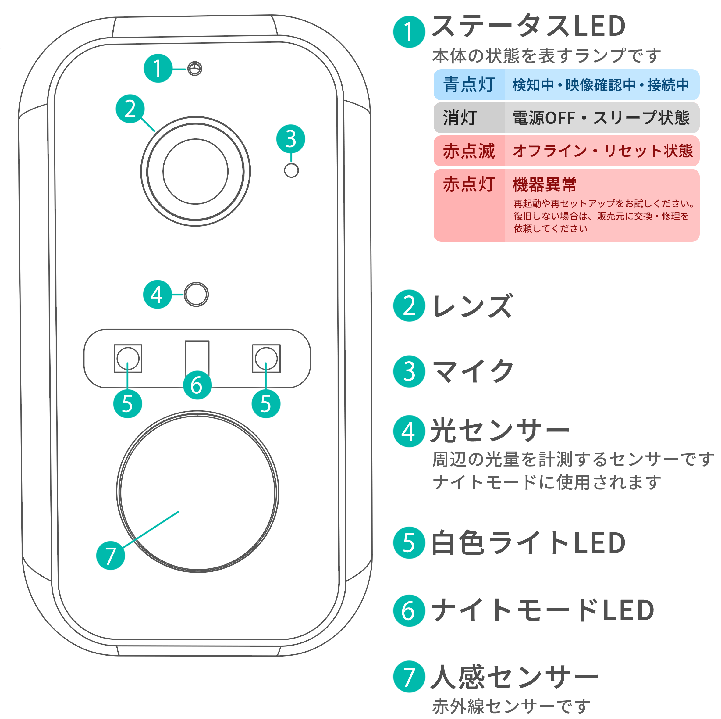 - フルカラーモード: 検知時またはリアルタイム映像確認時に白色ライトLEDが点灯します。