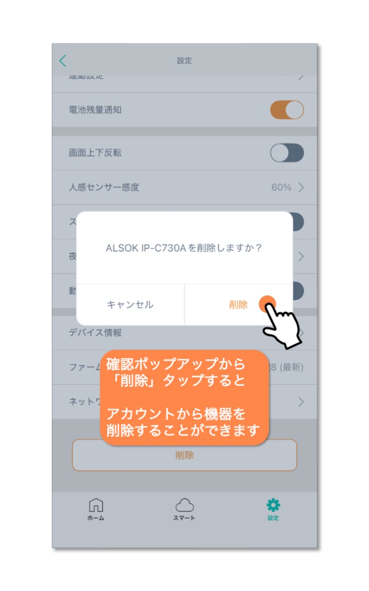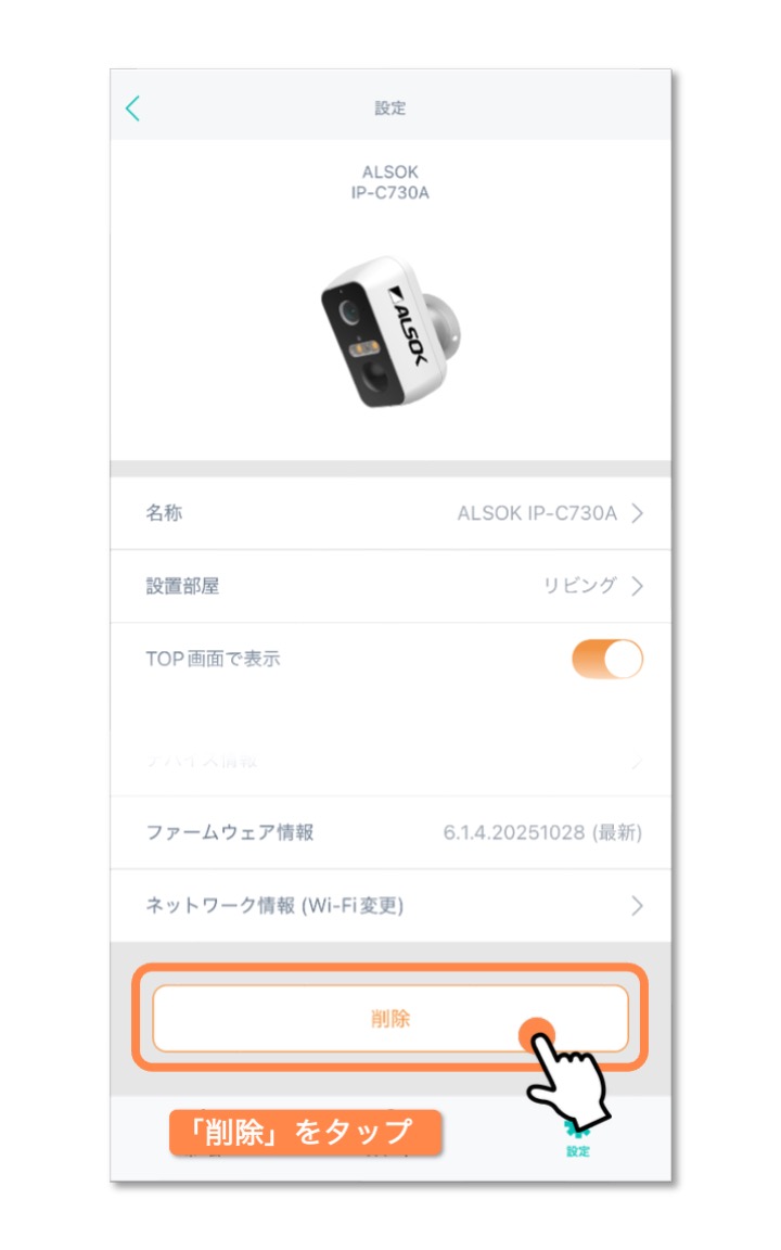 アカウントを削除する際にカメラ情報が残っていると、再度同じメールアドレスでアカウントを作成した際にそのカメラ情報を削除できなくなる可能性がありますのでご注意ください。