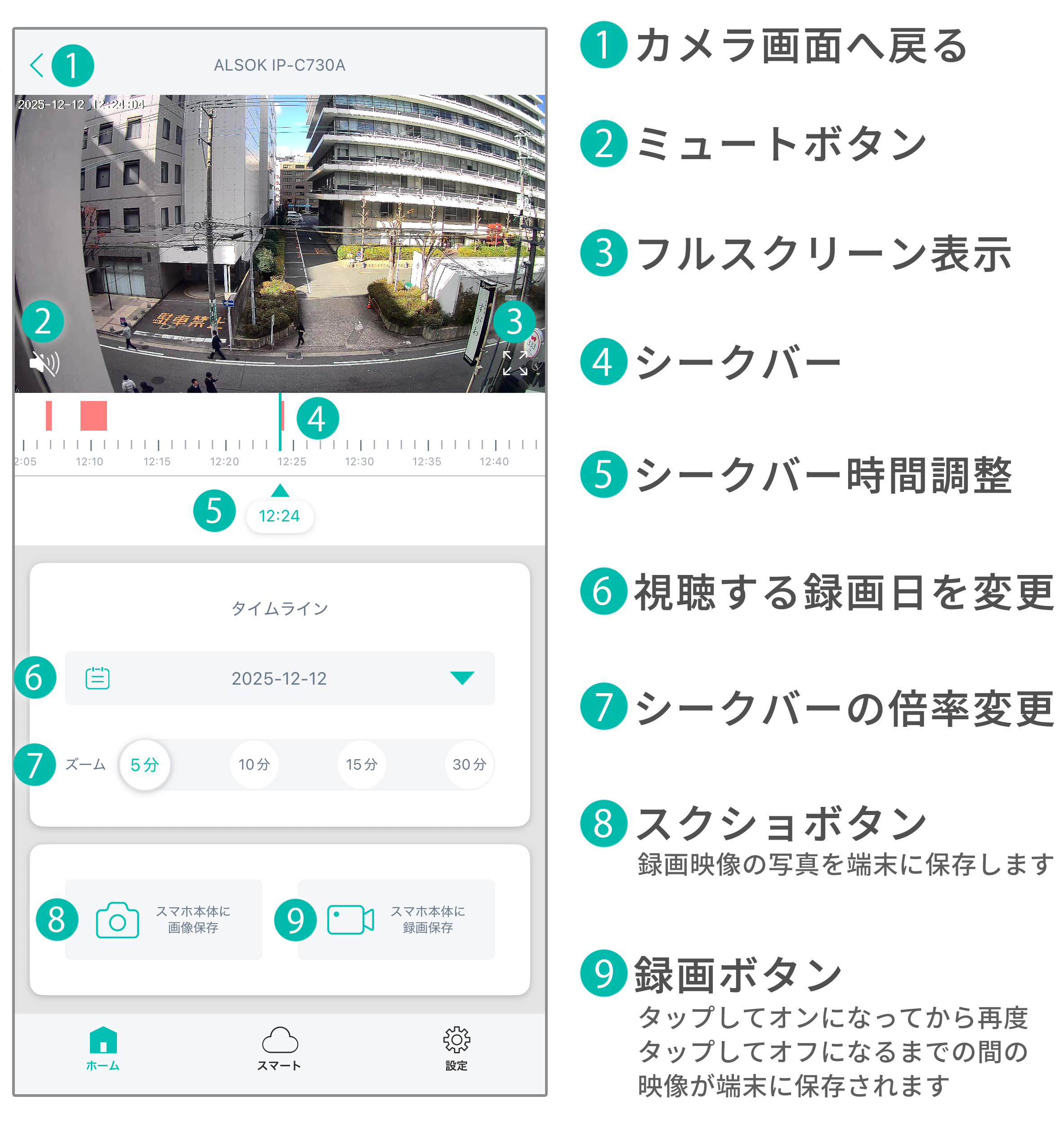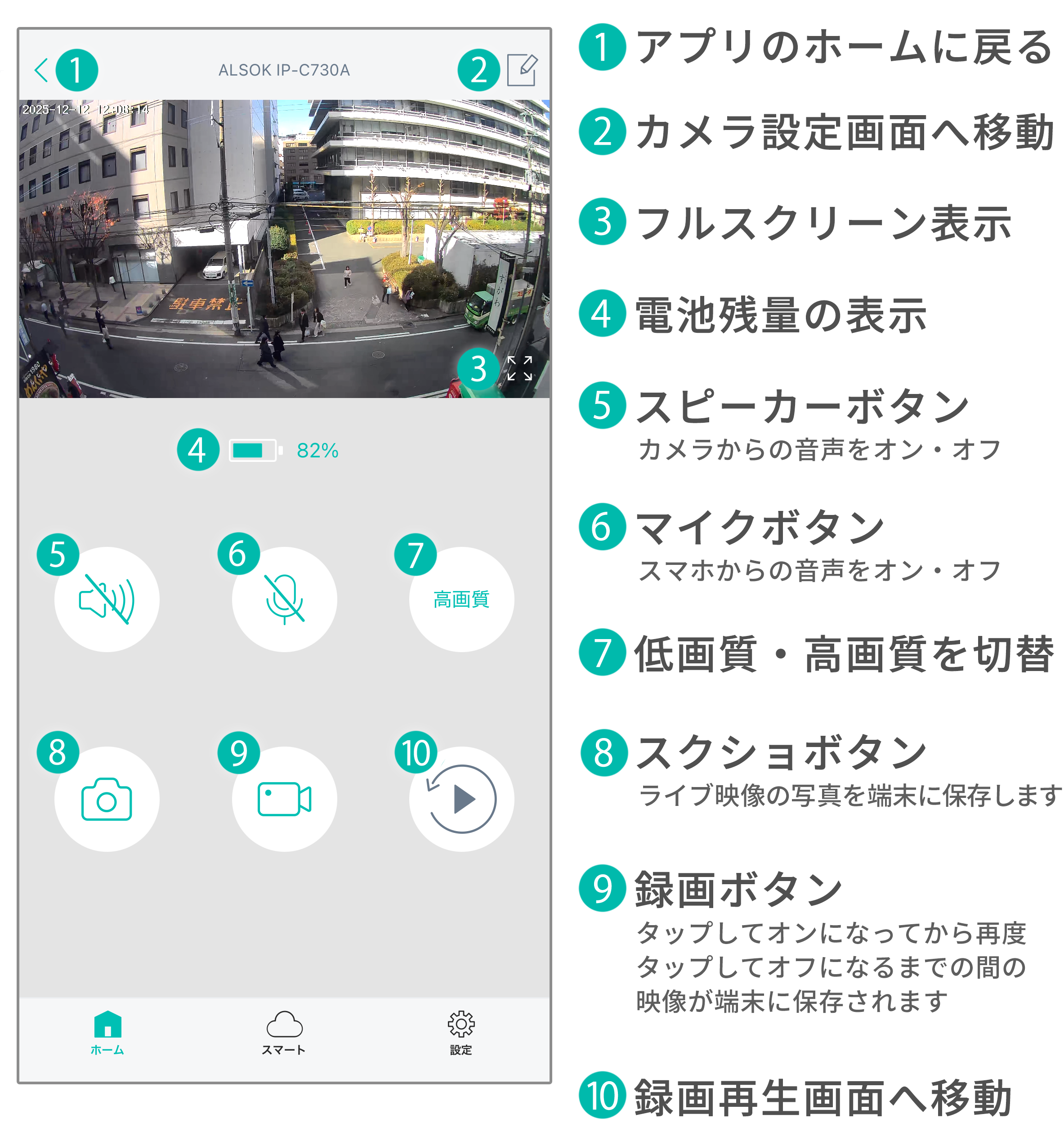 - ライブ映像、スクリーンショット(静止画像)をスマートフォン本体に保存できます。