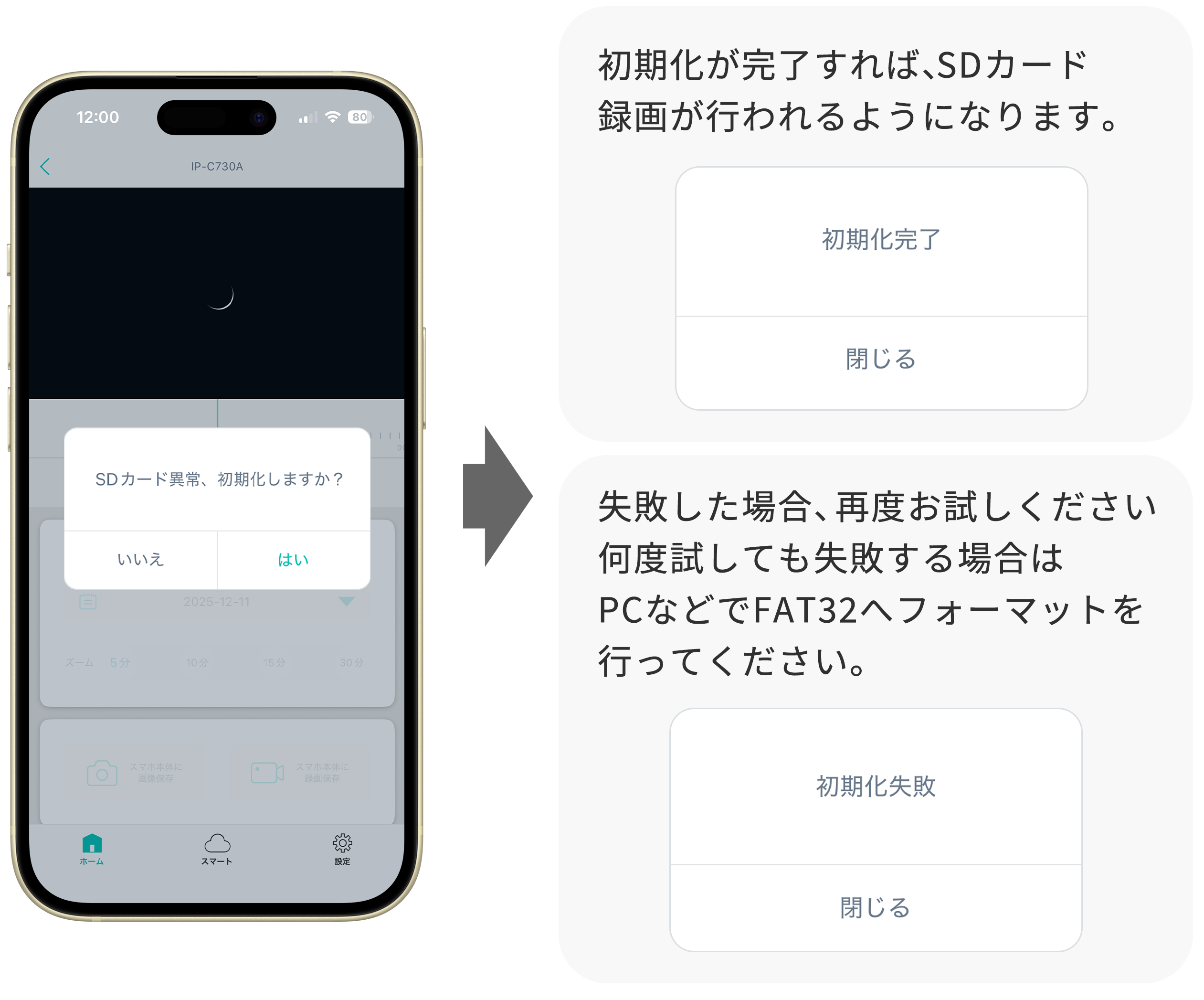 - FAT32以外のmicroSDカードをConnect Eyeに挿した状態で録画再生画面を表示すると、録画再生画面に次のポップアップが表示されます。