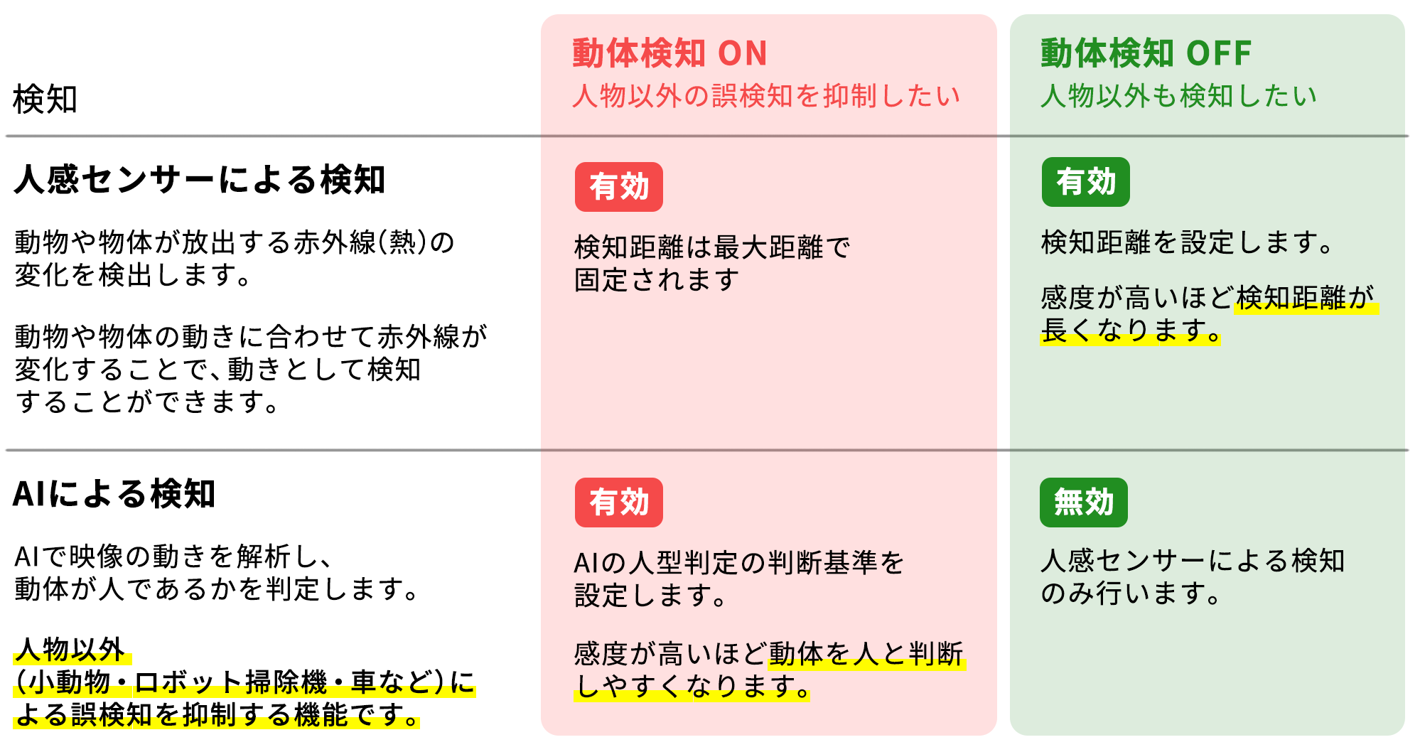 - 人物以外も検知したい場合は、動体検知をOFFにしてください。