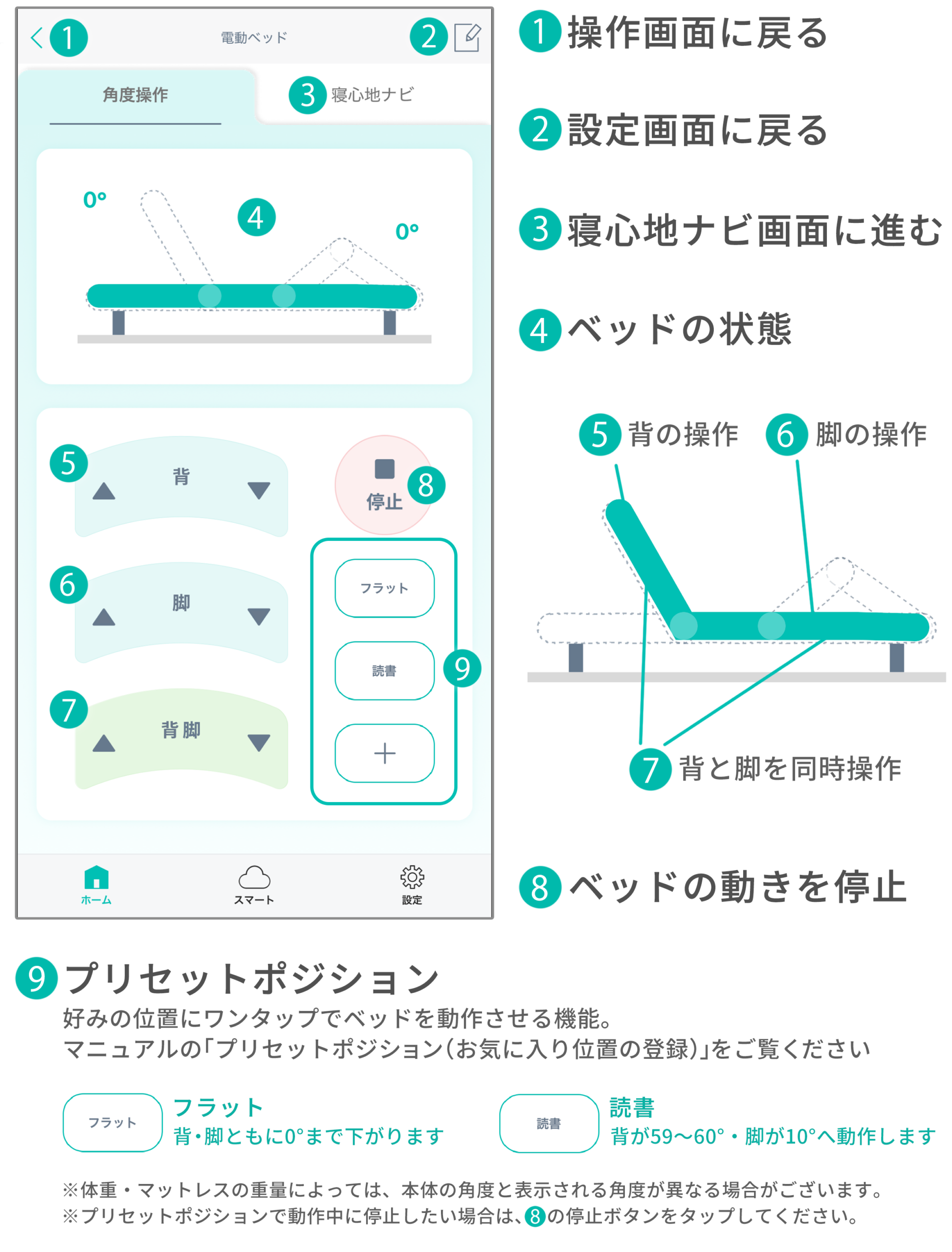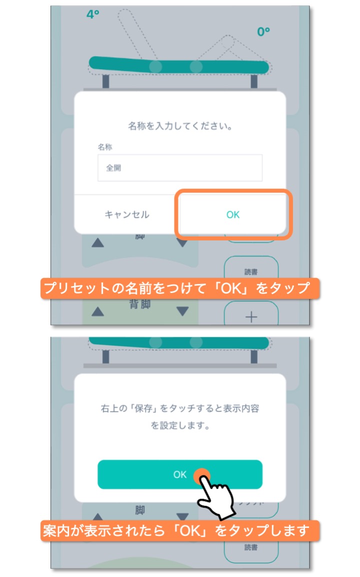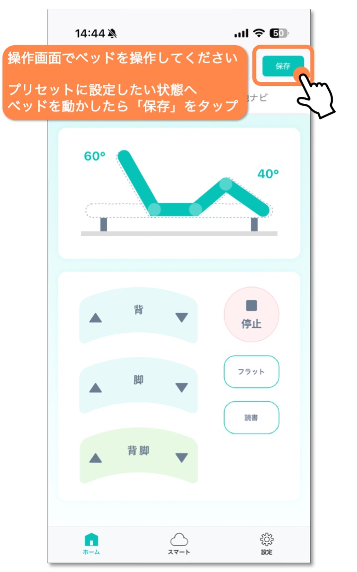 アプリでは、好みの位置にワンタップで動作させるプリセットポジション機能があります。