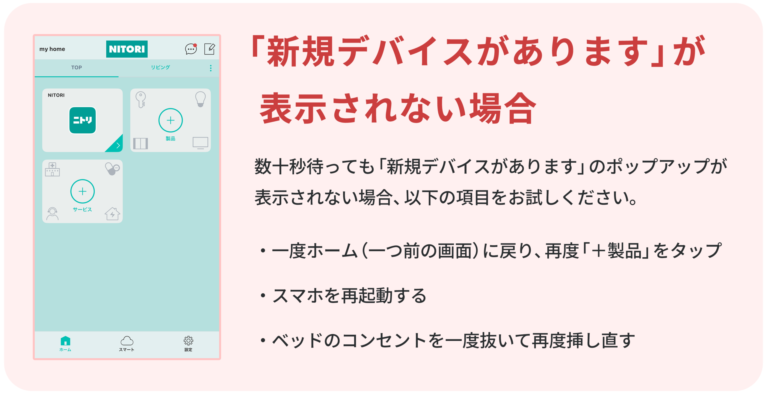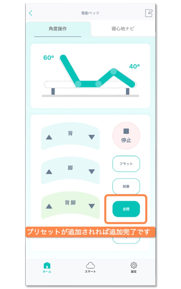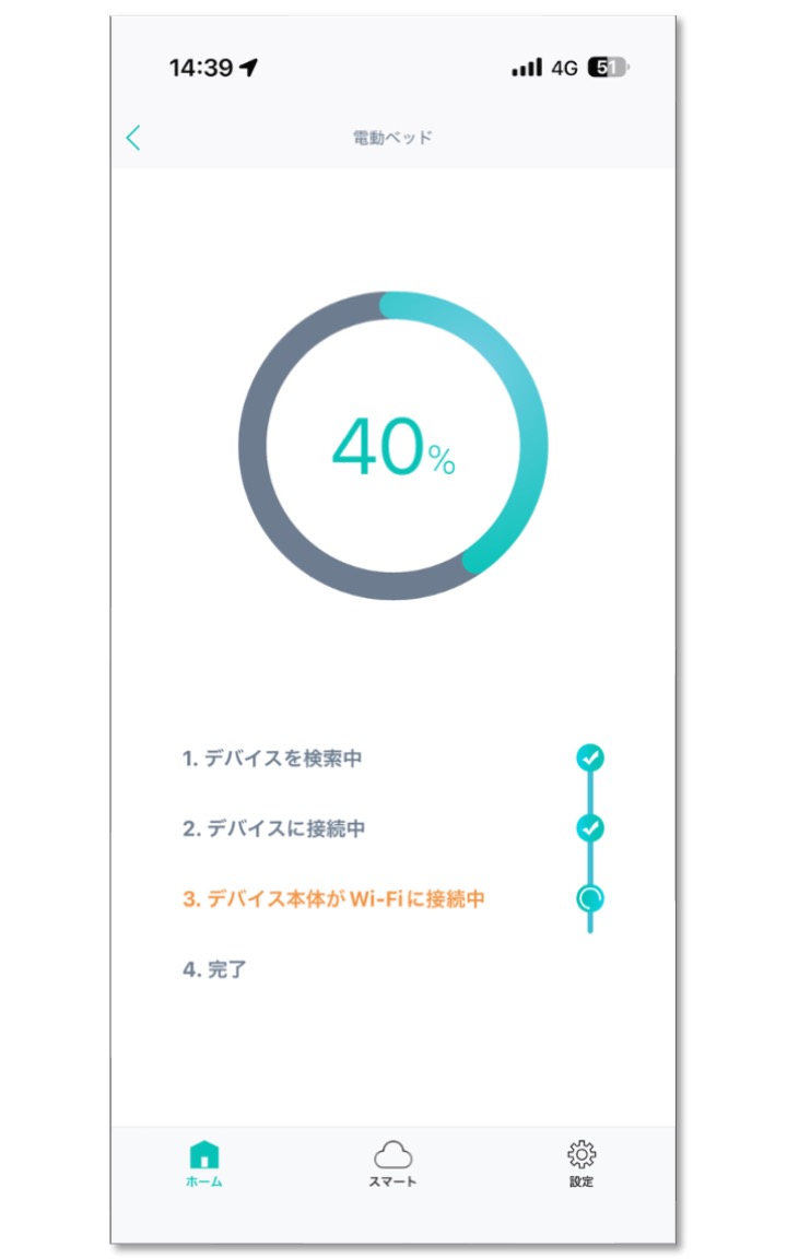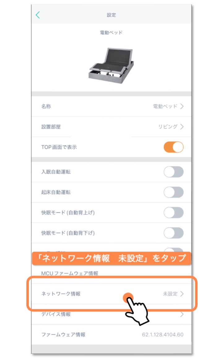 セットアップ待機状態になると、ベッド底面の装置のランプが青点滅します(可能であればご確認ください)