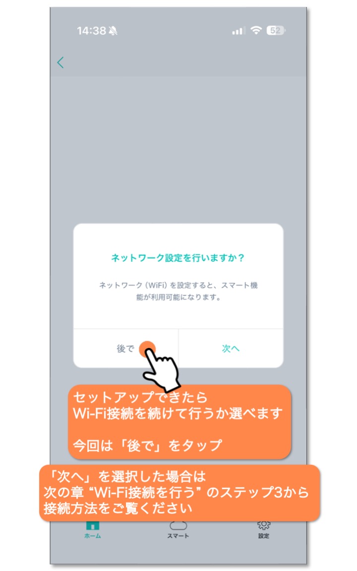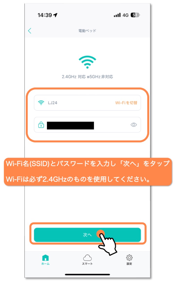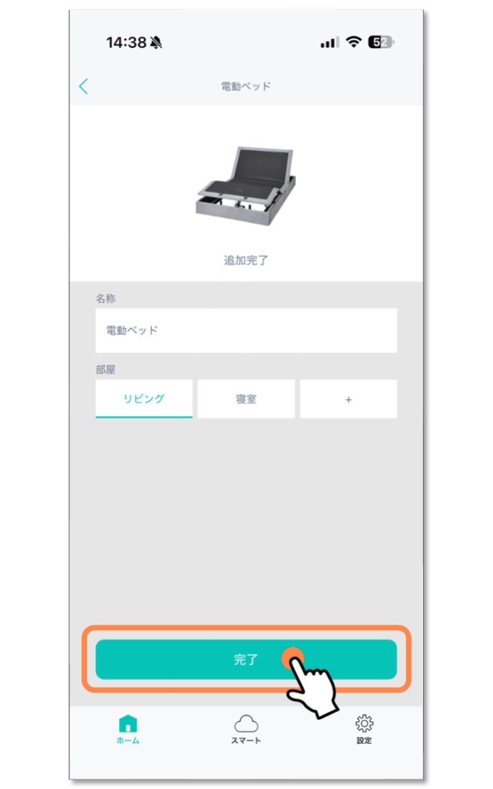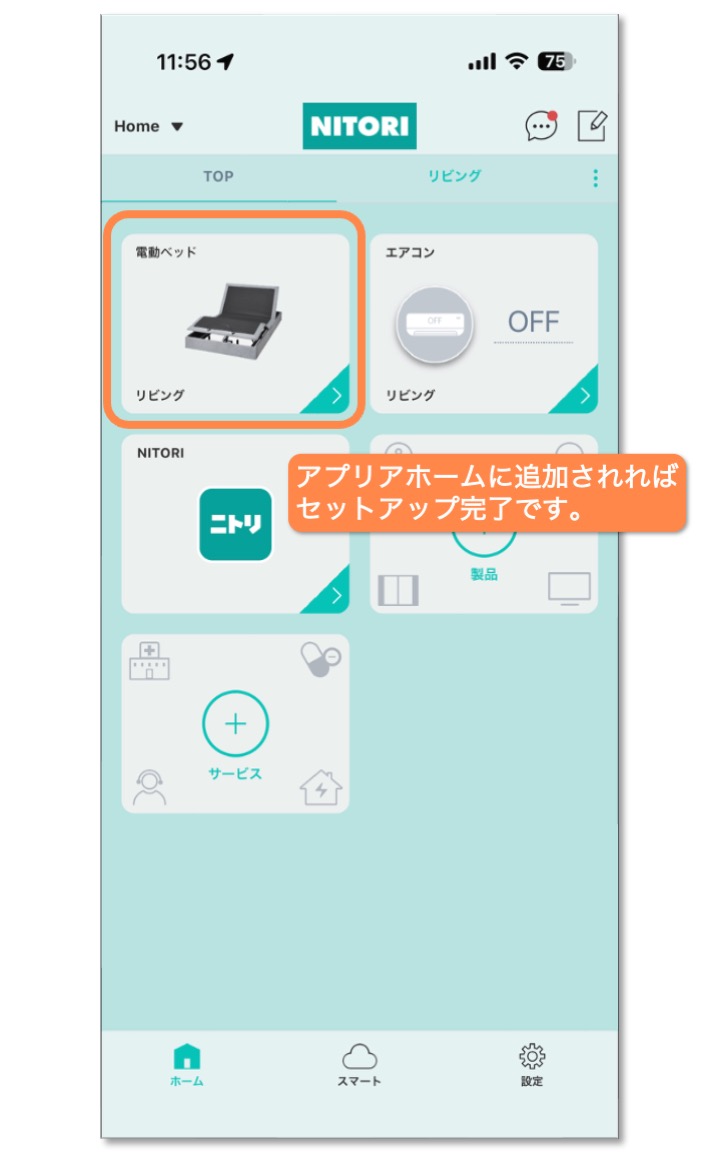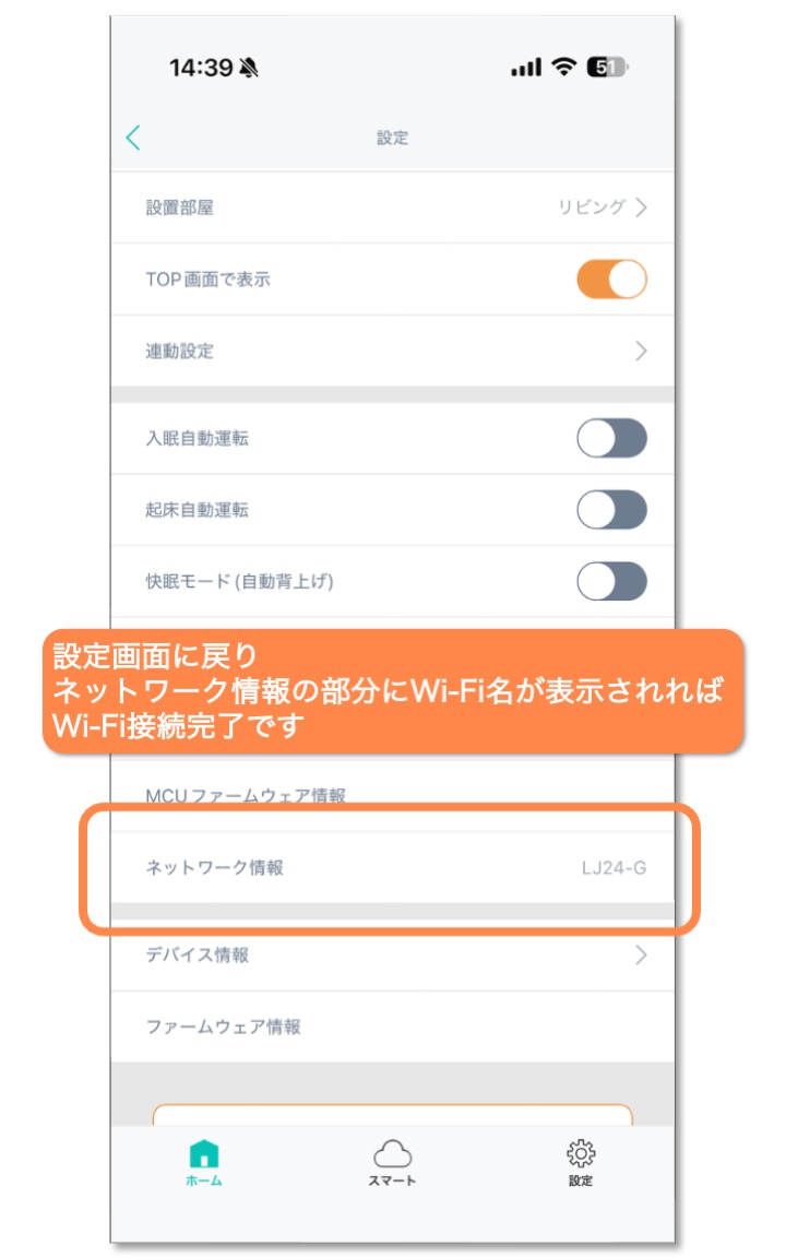 セットアップ待機状態になると、ベッド底面の装置のランプが青点滅します(可能であればご確認ください)