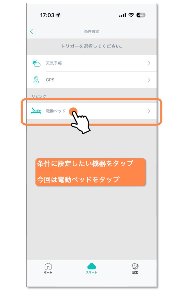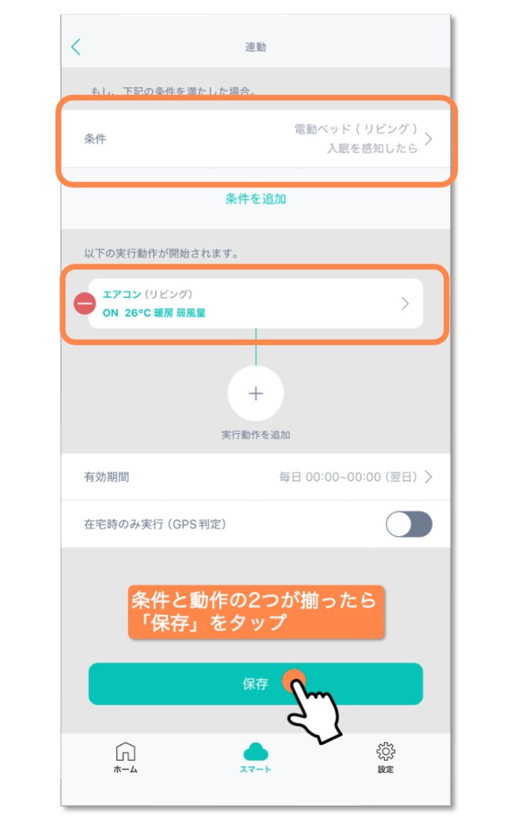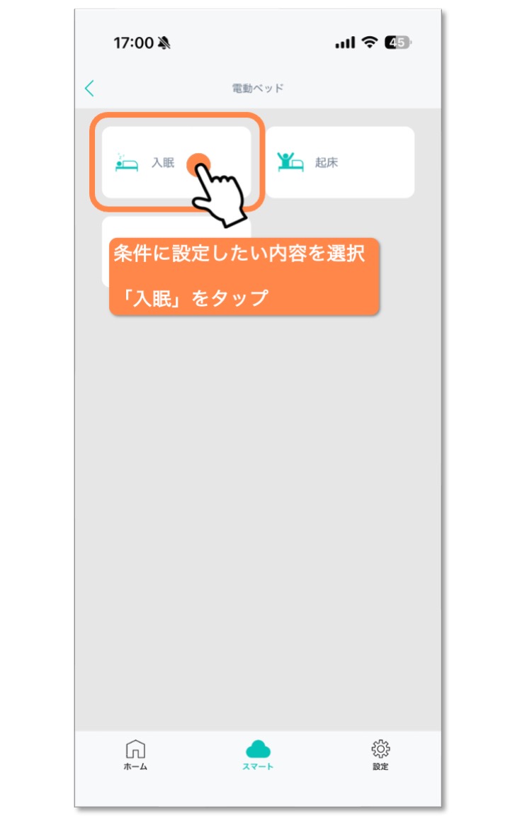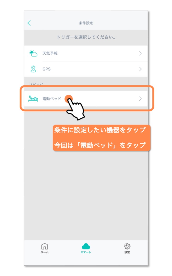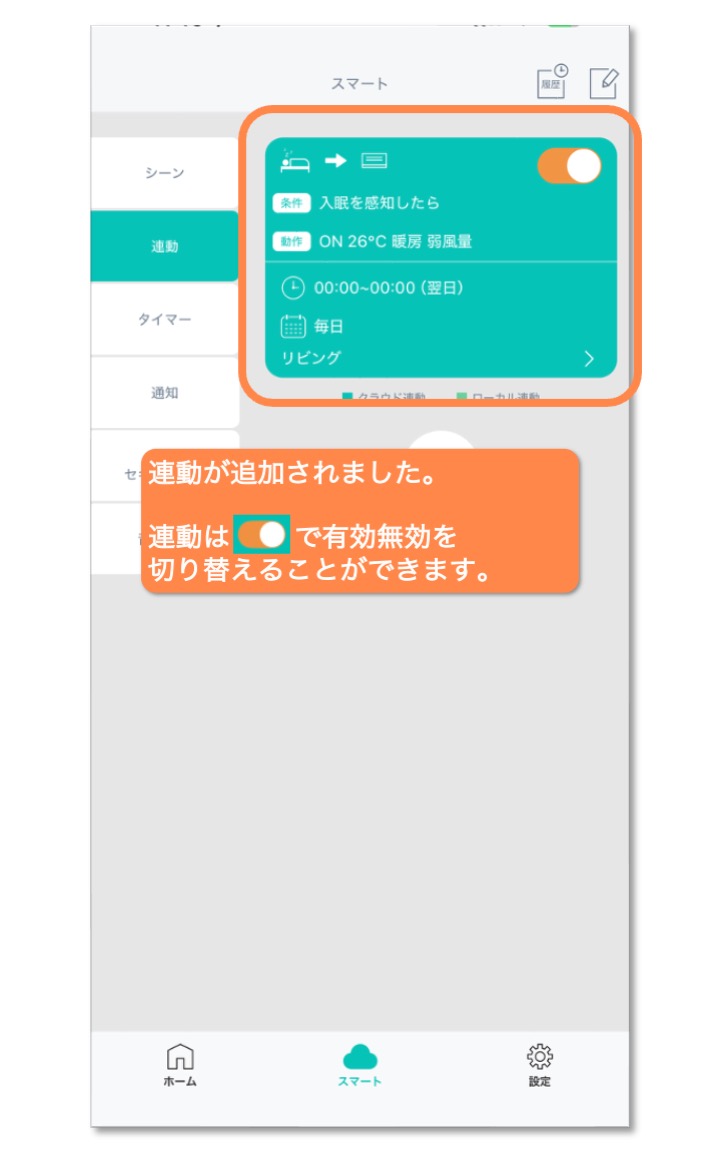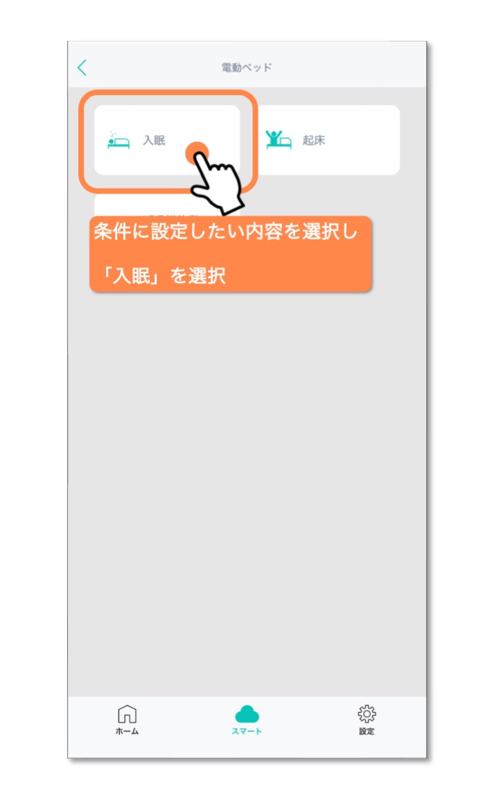 ここでは例として、「電動ベッドが入眠を検知したときにエアコンをオンにする」設定の手順を説明します。