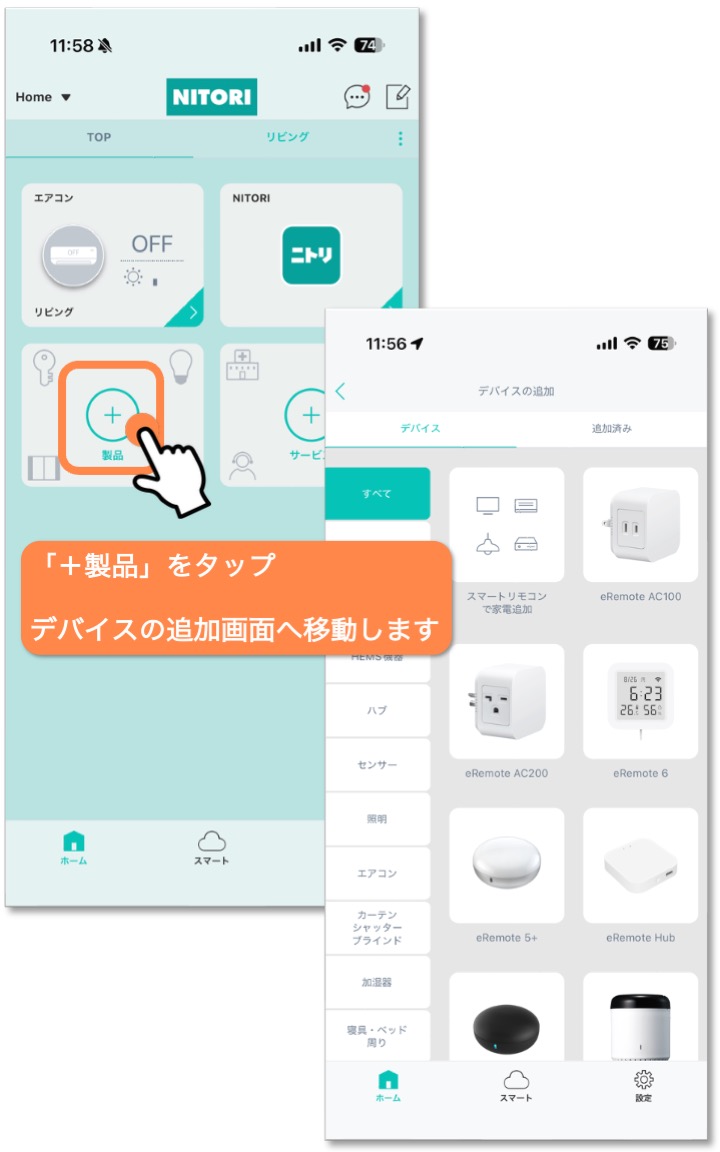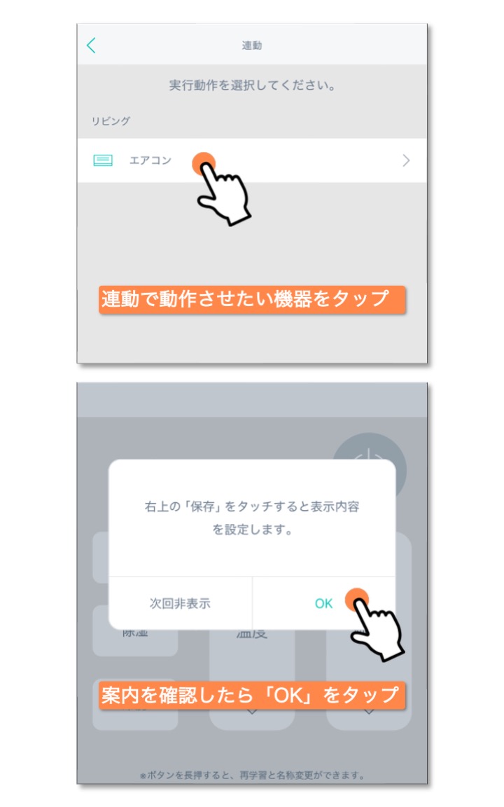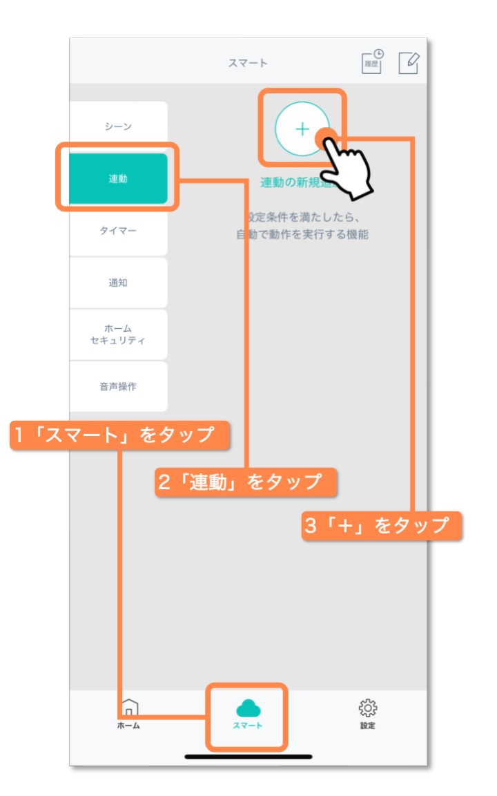 ※スマートLEDランプなどのBluetoothを使用して操作する機器を、連動機能で動作させる場合は、あらかじめハブと連携しておく必要がございます。詳細は各機器のマニュアルをご覧ください。