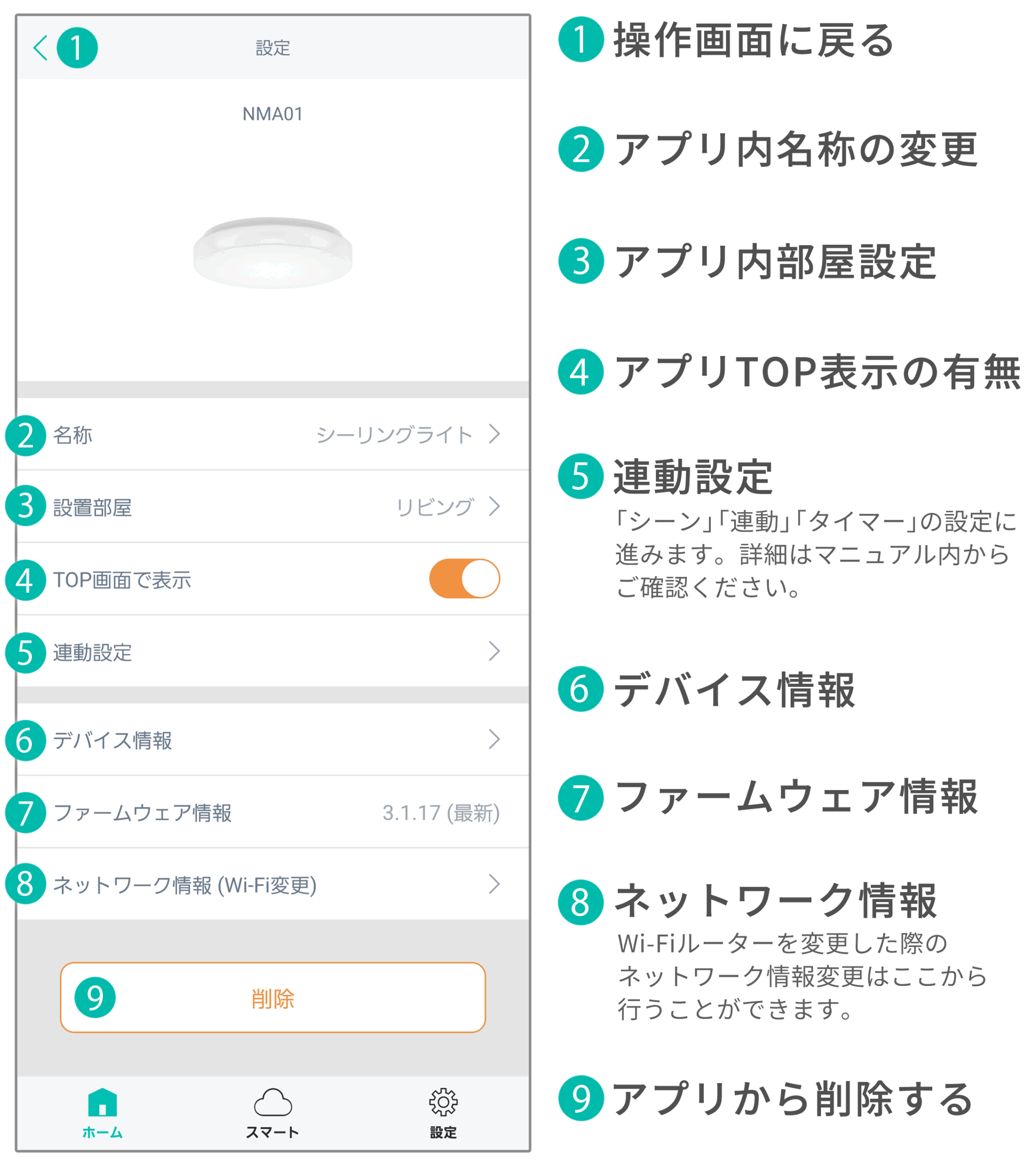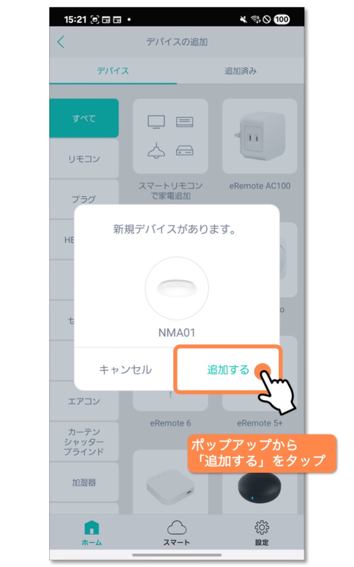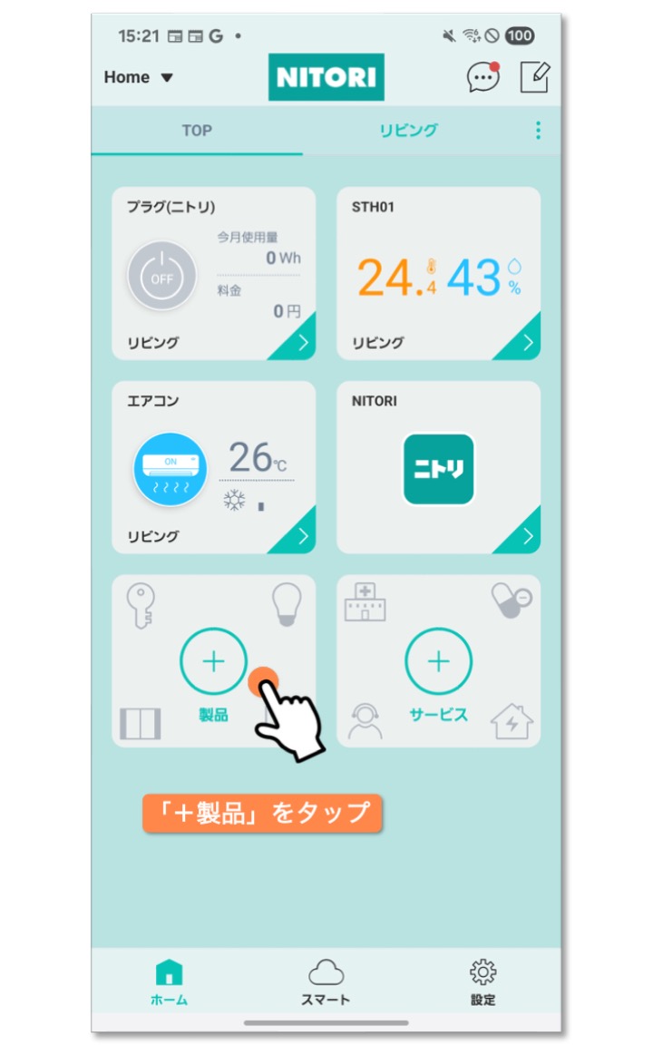 ここでは例として、「一括オン」シーンで「エアコン・ランプ・スマートプラグ」を動作させる手順を説明します。