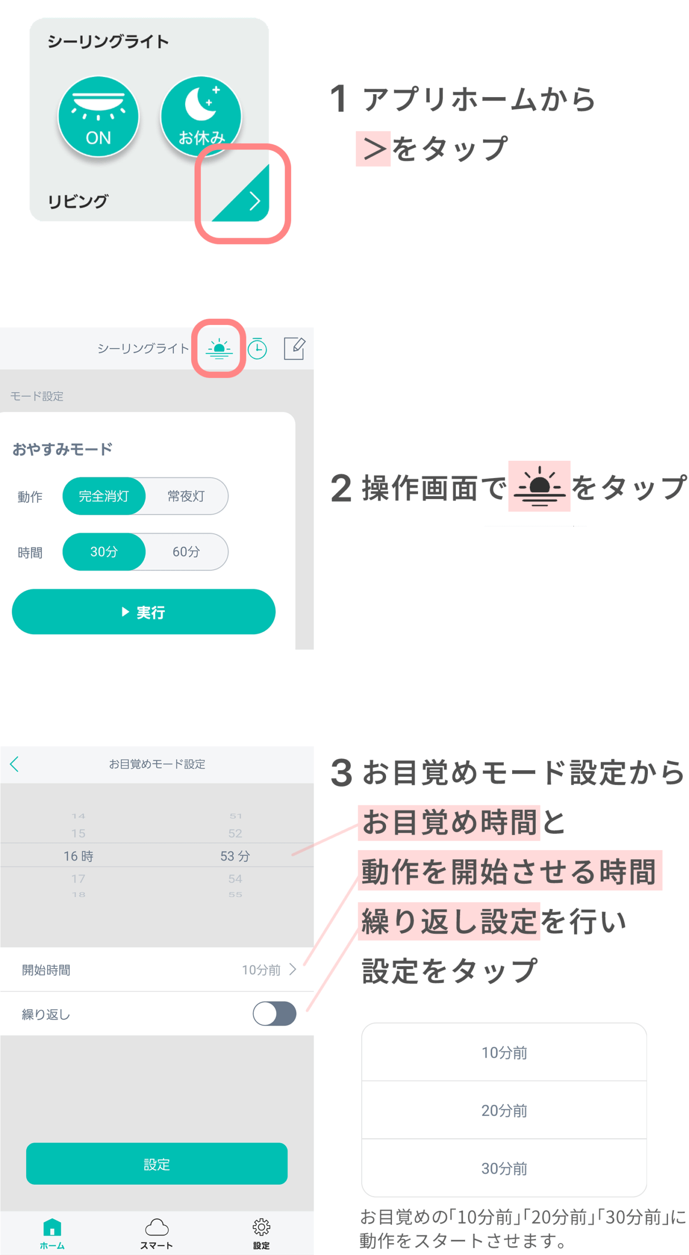 お目覚めモードは、設定した時間になると徐々に光量が明るくなり、心地よい目覚めをサポートする機能です。